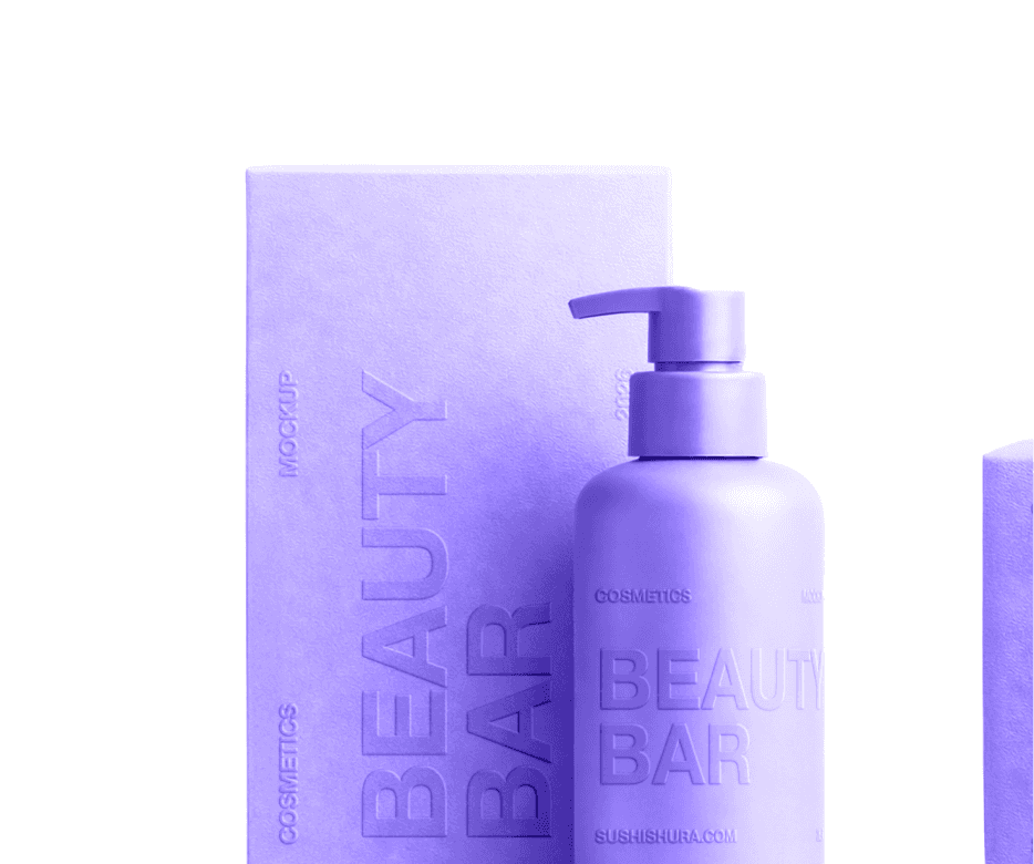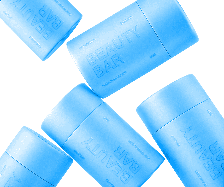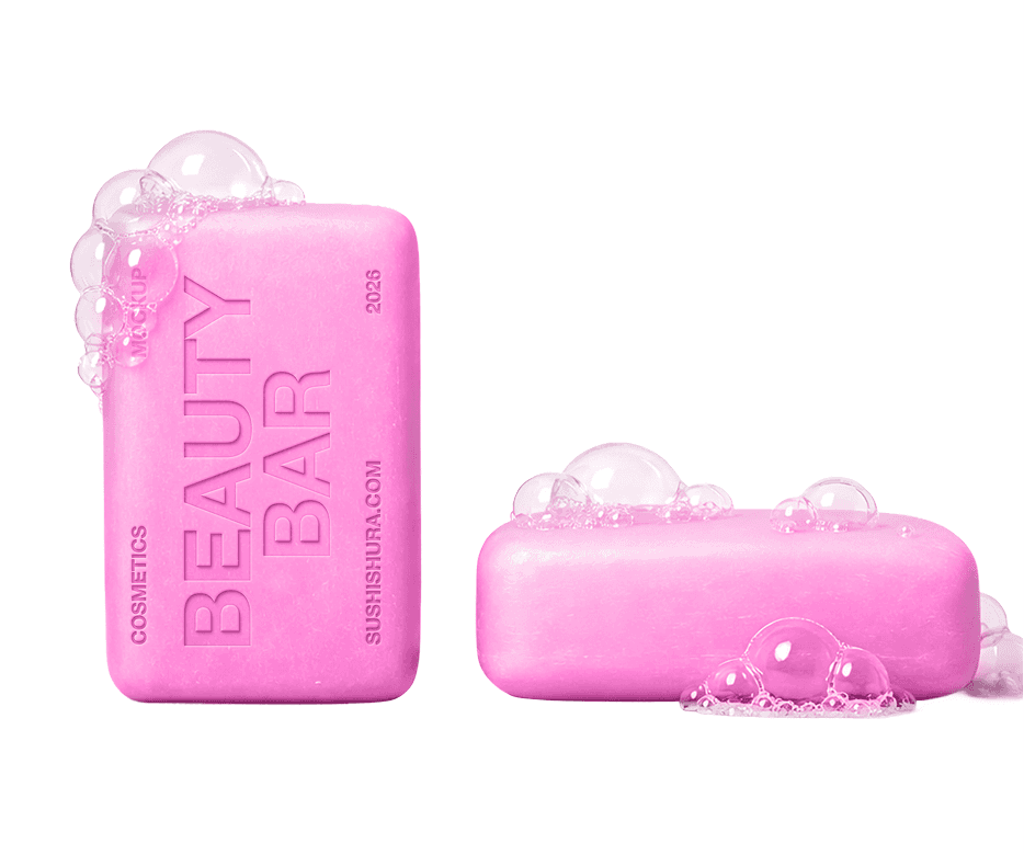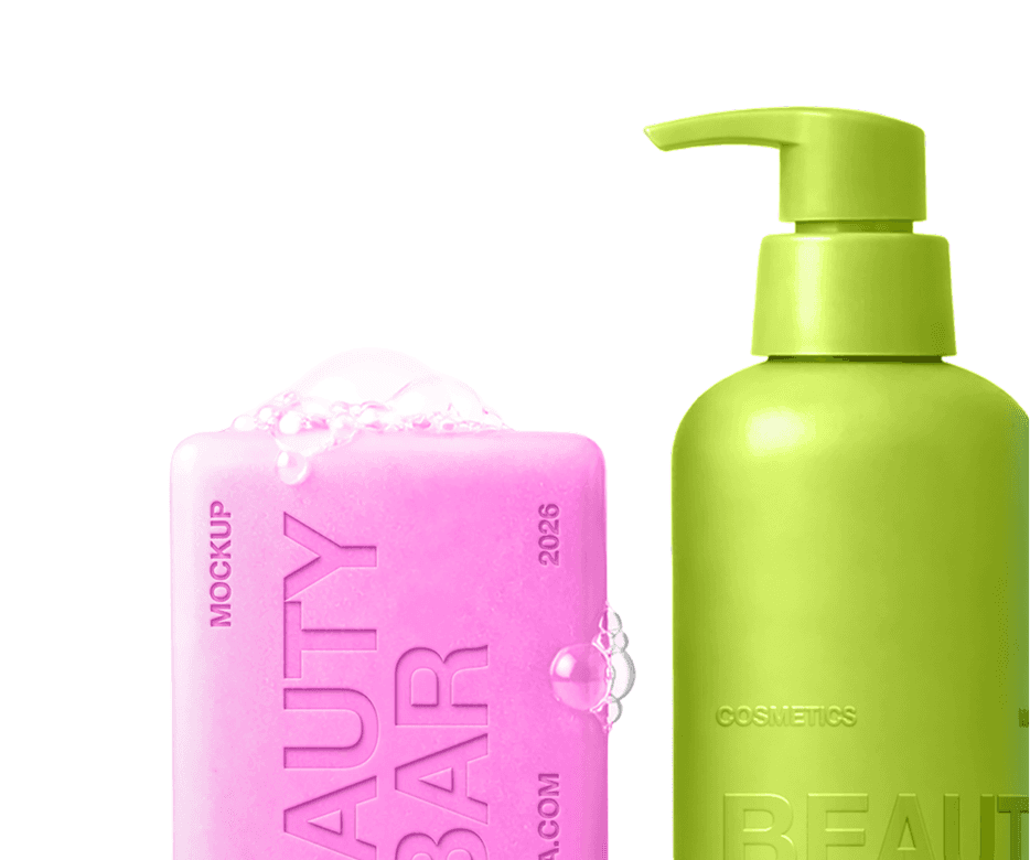 Beauty Bar Cosmetics Mockup Collection — includes packaging containers, soap bars, pump bottles, and lipstick tubes. Features embossed design effects with fully editable smart objects.