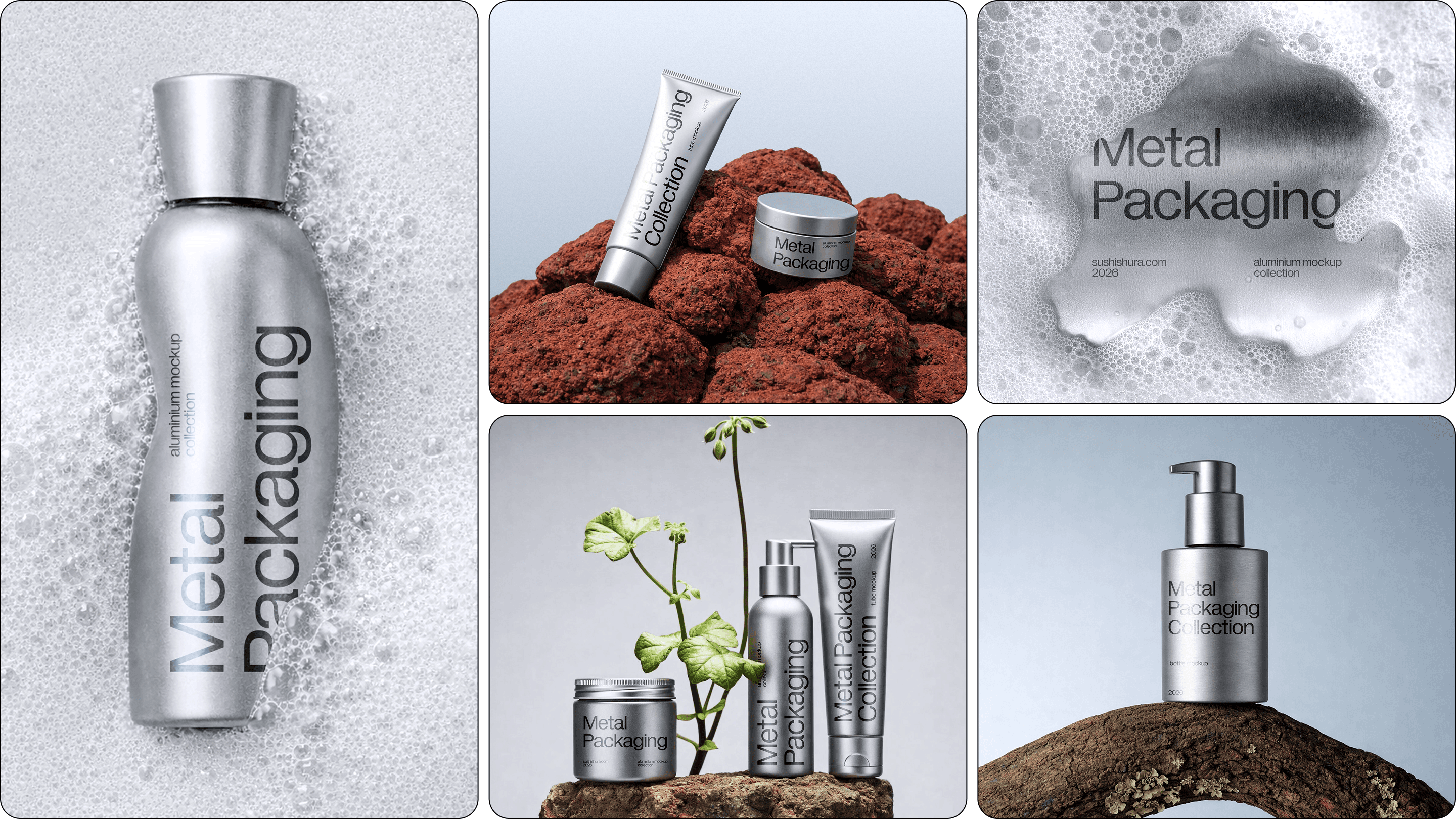 Beauty Bar Cosmetics Mockup Collection — includes packaging containers, soap bars, pump bottles, and lipstick tubes. Features embossed design effects with fully editable smart objects.